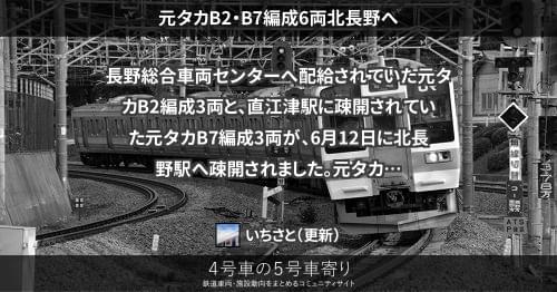 211系(東) 元タカB2・B7編成6両北長野へ 長野総合車両センターへ配給されていた元タカB2編成3両と、直江津駅に疎開されていた元タカB7編成3両が、6月12日に北長野駅へ疎開されました。元タカB7編成3両は5月29日に長野総合車両センターへ返却されていました。 2013/06/12 いちさと 211系(東)