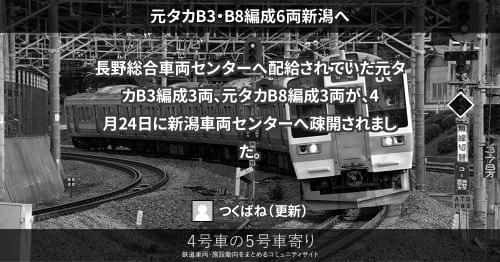211系(東) 元タカB3・B8編成6両新潟へ 長野総合車両センターへ配給されていた元タカB3編成3両、元タカB8編成3両が、4月24日に新潟車両センターへ疎開されました。 2013/04/24 つくばね 211系(東)