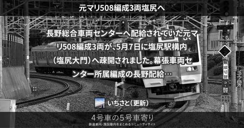 211系(東) 元マリ508編成3両塩尻へ 長野総合車両センターへ配給されていた元マリ508編成3両が、5月7日に塩尻駅構内(塩尻大門)へ疎開されました。幕張車両センター所属編成の長野配給後の疎開は初めてです。 2013/05/07 いちさと 211系(東)