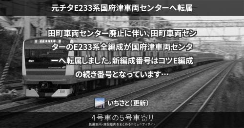 E233系 元チタE233系国府津車両センターへ転属 田町車両センター廃止に伴い、田町車両センターのE233系全編成が国府津車両センターへ転属しました。新編成番号はコツE編成の続き番号となっています。 2013/03/16 いちさと E233系
