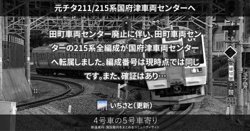 211系(東) 元チタ211/215系国府津車両センターへ 田町車両センター廃止に伴い、田町車両センターの215系全編成が国府津車両センターへ転属しました。編成番号は現時点では同じです。 また、確証はありませんが、田町車両センターに車籍が残る211系についても国府津車両センター転属扱いとしました。車両自体はすでに地方へ疎開されています。公式情報が得られ次第、訂正するかもしれません。 2013/03/16 いちさと 211系(東)