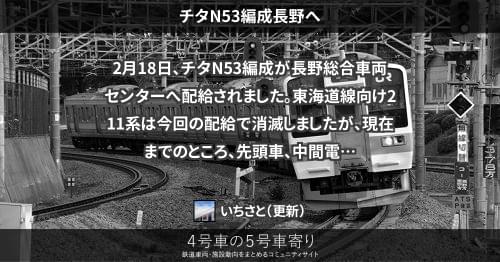 211系(東) チタN53編成長野へ 2月18日、チタN53編成が長野総合車両センターへ配給されました。 東海道線向け211系は今回の配給で消滅しましたが、現在までのところ、先頭車、中間電動車全てと、グリーン車の一部が保管されています。 2013/02/18 いちさと 211系(東)