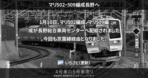 211系(東) マリ502・509編成長野へ 1月10日、マリ502編成、マリ509編成が長野総合車両センターへ配給されました。今回も京葉線経由となりました。 2013/01/10 いちさと 211系(東)
