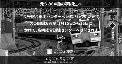 211系(東) 元タカC4編成6両桐生へ 長野総合車両センターへ配給されていた元タカC4編成6両が、1月15日から16日にかけて、高崎総合訓練センターへ疎開されました。 2013/01/15 つくばね 211系(東)