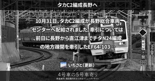 211系(東) タカC2編成長野へ 10月31日、タカC2編成が長野総合車両センターへ配給されました。牽引については、前日に長野から直江津までチタN24編成の地方疎開を牽引したEF64-1031が担当しました。 2012/10/31 いちさと 211系(東)
