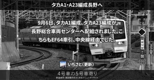 211系(東) タカA1・A23編成長野へ 9月6日、タカA1編成、タカA23編成が長野総合車両センターへ配給されました。こちらもEF64牽引、中央線経由でした。 2012/09/06 いちさと 211系(東)