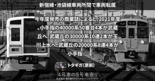 今年度発売の商業誌によると、2021年度、小手指の40000系50番台4本が武蔵丘へ、武蔵丘の30000系10連2本が玉川上水へ、武蔵丘の20000系8連4本が小手指へ、武蔵丘の20000系10連1本が玉川上水へ、玉川上水の2000系4連2本が南入曽へ、南入曽の2000系8連1本が武蔵丘へ、それぞれ転属しました。また多摩川線・狭山線の車両交換として、小手指から玉川上水へ4本、玉川上水から小手指へ5本が転属しました。
