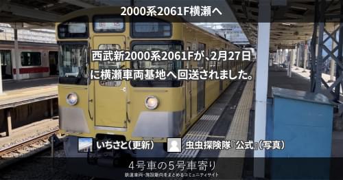 西武 2000系2061F横瀬へ 西武新2000系2061Fが、2月27日に横瀬車両基地へ回送されました。 https://4gousya.net/forums/post/%e8%a5%bf%e6%ad%a62057f%e6%a8%aa%e7%80%ac%e3%81%b8%e8%87%a8%e6%99%82%e5%9b%9e%e9%80%81 2023/02/17 いちさと 西武