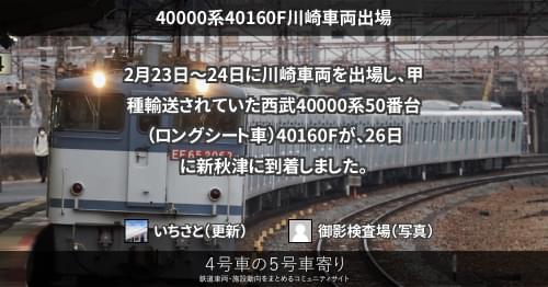西武 40000系40160F川崎車両出場 2月23日~24日に川崎車両を出場し、甲種輸送されていた西武40000系50番台(ロングシート車)40160Fが、26日に新秋津に到着しました。 https://4gousya.net/forums/post/%e8%a5%bf%e6%ad%a640160f-%e5%b7%9d%e5%b4%8e%e8%bb%8a%e4%b8%a1%e5%87%ba%e5%a0%b4 2023/02/26 いちさと 西武