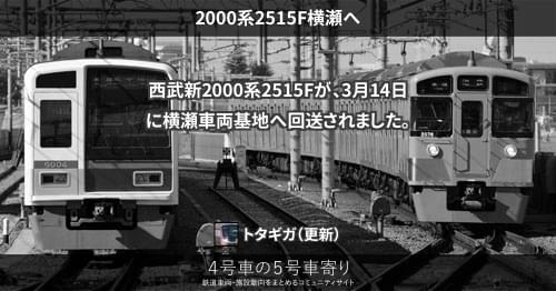 西武 2000系2515F横瀬へ 西武新2000系2515Fが、3月14日に横瀬車両基地へ回送されました。 https://4gousya.net/forums/post/%e8%a5%bf%e6%ad%a62515f%e3%81%8c%e6%a8%aa%e7%80%ac%e3%81%b8%e8%87%a8%e6%99%82%e5%9b%9e%e9%80%81 2023/03/14 トタギガ 西武