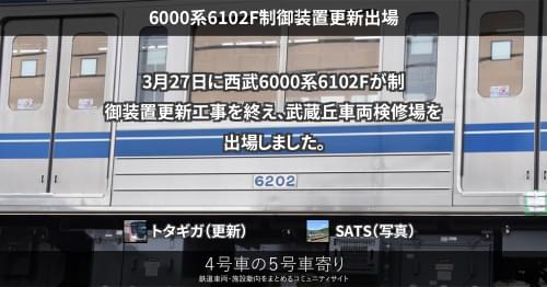 西武 6000系6102F制御装置更新出場 3月27日に西武6000系6102Fが制御装置更新工事を終え、武蔵丘車両検修場を出場しました。 https://4gousya.net/forums/post/%e8%a5%bf%e6%ad%a66102f-vvvf%e6%9b%b4%e6%96%b0%e3%81%bb%e3%81%8b 2023/03/27 2023/03/28 トタギガ 西武