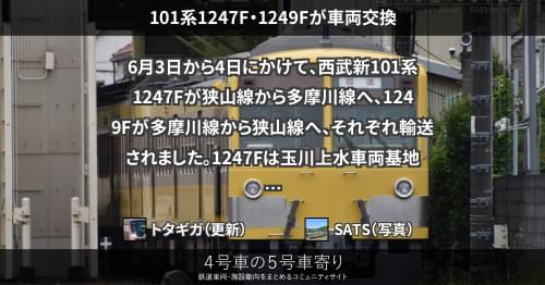 西武 101系1247F・1249Fが車両交換 6月3日から4日にかけて、西武新101系1247Fが狭山線から多摩川線へ、1249Fが多摩川線から狭山線へ、それぞれ輸送されました。 1247Fは玉川上水車両基地へ転属、1249Fは小手指車両基地へ転属として扱います。 2023/06/04 トタギガ 西武