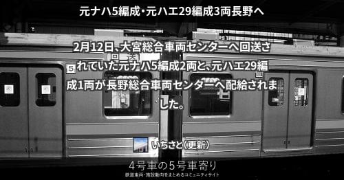 205系(東) 元ナハ5編成・元ハエ29編成3両長野へ 2月12日、大宮総合車両センターへ回送されていた元ナハ5編成2両と、元ハエ29編成1両が長野総合車両センターへ配給されました。 2015/02/12 いちさと 205系(東)