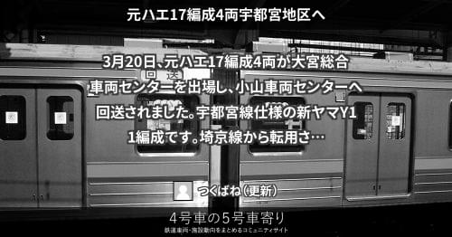 205系(東) 元ハエ17編成4両宇都宮地区へ 3月20日、元ハエ17編成4両が大宮総合車両センターを出場し、小山車両センターへ回送されました。宇都宮線仕様の新ヤマY11編成です。 埼京線から転用された205系600番台ですが、便宜上「京葉線の世代交代」に反映しています。 2014/03/20 つくばね 205系(東)