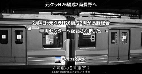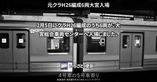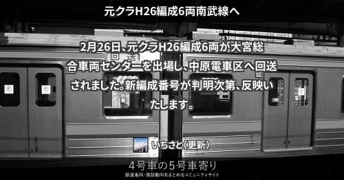 205系(東) 元クラH26編成6両南武線へ 2月26日、元クラH26編成6両が大宮総合車両センターを出場し、中原電車区へ回送されました。 新編成番号が判明次第、反映いたします。 2014/02/26 いちさと 205系(東)