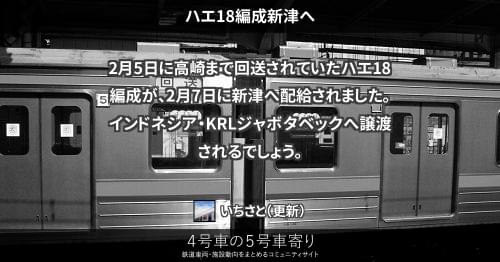 205系(東) ハエ18編成新津へ 2月5日に高崎まで回送されていたハエ18編成が、2月7日に新津へ配給されました。インドネシア・KRLジャボタベックへ譲渡されるでしょう。 2014/02/07 いちさと 205系(東)