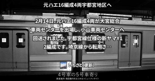 205系(東) 元ハエ16編成4両宇都宮地区へ 2月14日、元ハエ16編成4両が大宮総合車両センターを出場し、小山車両センターへ回送されました。宇都宮線仕様の新ヤマY12編成です。 埼京線から転用された205系600番台は初めてです。便宜上「京葉線の世代交代」に反映しています。 2014/02/14 いちさと 205系(東)
