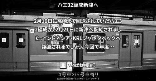 205系(東) ハエ32編成新津へ 2月19日に高崎まで回送されていたハエ32編成が、2月21日に新津へ配給されました。インドネシア・KRLジャボタベックへ譲渡されるでしょう。今回で年度内にインドネシア譲渡が予定されていた180両の配給が終了しました。 2014/02/21 つくばね 205系(東)