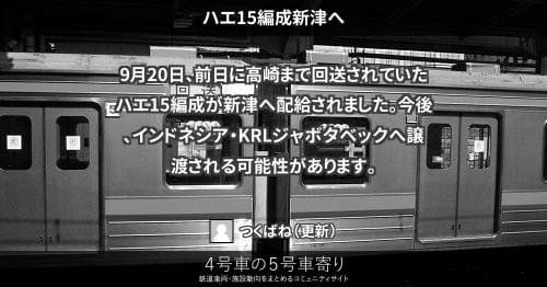 205系(東) ハエ15編成新津へ 9月20日、前日に高崎まで回送されていたハエ15編成が新津へ配給されました。今後、インドネシア・KRLジャボタベックへ譲渡される可能性があります。 2013/09/20 つくばね 205系(東)
