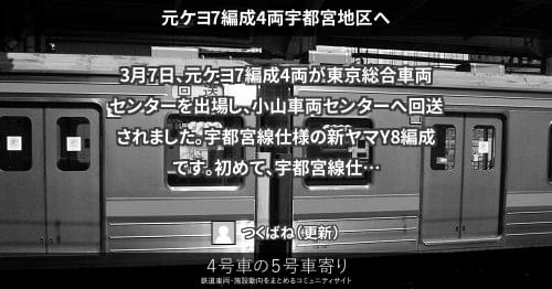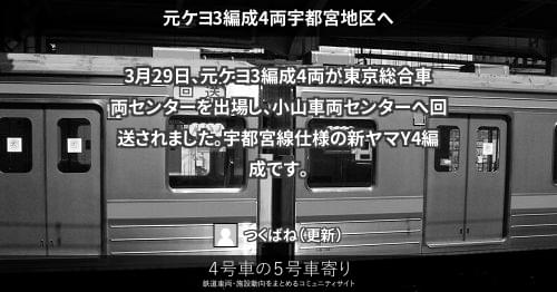 205系(東) 元ケヨ3編成4両宇都宮地区へ 3月29日、元ケヨ3編成4両が東京総合車両センターを出場し、小山車両センターへ回送されました。宇都宮線仕様の新ヤマY4編成です。 2013/03/29 つくばね 205系(東)