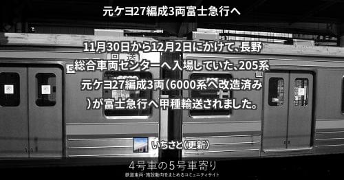205系(東) 元ケヨ27編成3両富士急行へ 11月30日から12月2日にかけて、長野総合車両センターへ入場していた、205系元ケヨ27編成3両(6000系へ改造済み)が富士急行へ甲種輸送されました。 2012/11/30 いちさと 205系(東)