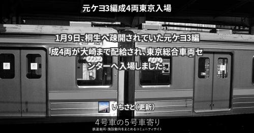 205系(東) 元ケヨ2編成大宮入場・ケヨ7編成東京入場 11月7日から8日にかけて、直江津へ疎開されていた元ケヨ2編成4両、ケヨ7編成4両が長野・八王子経由で大宮まで配給されました。 元ケヨ2編成4両はそのまま大宮総合車両センターへ入場しましたが、元ケヨ7編成は9日に東京総合車両センターへ入場しました。 2012/11/07 いちさと 205系(東)