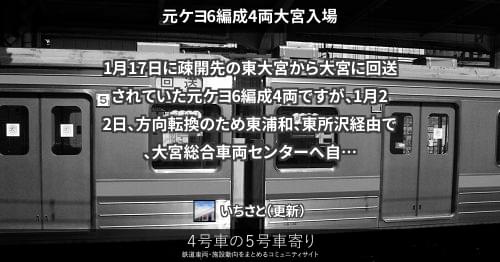 205系(東) 元ケヨ6編成4両大宮入場 1月17日に疎開先の東大宮から大宮に回送されていた元ケヨ6編成4両ですが、1月22日、方向転換のため東浦和、東所沢経由で、大宮総合車両センターへ自力回送されました。そのまま入場するでしょう。 2013/01/22 いちさと 205系(東)
