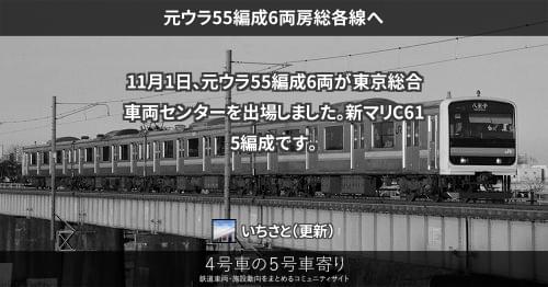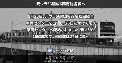 209系 元ウラ56編成6両房総各線へ 9月25日、元ウラ56編成6両が秋田総合車両センターを出場し、26日にかけて尾久車両センターへ配給されました。新マリC616編成です。同編成は27日に幕張車両センターへ回送されています。 2012/09/25 いちさと 209系