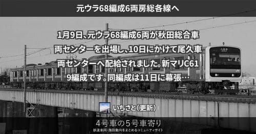 209系 元ウラ68編成6両房総各線へ 1月9日、元ウラ68編成6両が秋田総合車両センターを出場し、10日にかけて尾久車両センターへ配給されました。新マリC619編成です。同編成は11日に幕張車両センターへ回送されています。 2013/01/09 いちさと 209系