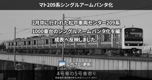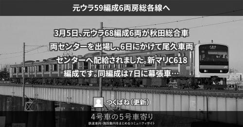 209系 元ウラ59編成6両房総各線へ 3月5日、元ウラ68編成6両が秋田総合車両センターを出場し、6日にかけて尾久車両センターへ配給されました。新マリC618編成です。同編成は7日に幕張車両センターへ回送されています。 209系の房総転属改造工事は今回のマリC618編成で終了しましたが、コンテンツ自体は中原車の機器更新まで反映したいと思っています。 2013/03/05 つくばね 209系