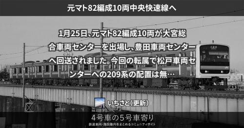 209系 元マト82編成10両中央快速線へ 1月25日、元マト82編成10両が大宮総合車両センターを出場し、豊田車両センターへ回送されました。 今回の転属で松戸車両センターへの209系の配置は無くなりました。 2019/01/25 2019/01/26 いちさと 209系