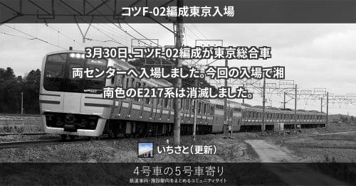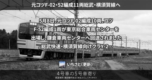 E217系 元コツF-02・52編成11両総武・横須賀線へ 5月8日、元コツF-02編成10両、コツF-52編成1両が東京総合車両センターを出場し、鎌倉車両センターへ回送されました。総武快速・横須賀線向けクラY-2編成です。 2015/05/08 いちさと E217系