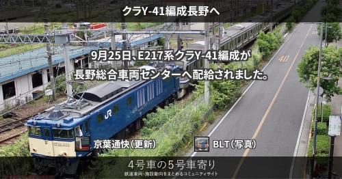 E217系 クラY-41編成長野へ 9月25日、E217系クラY-41編成が長野総合車両センターへ配給されました。 https://4gousya.net/forums/post/%E3%82%AF%E3%83%A9y-41%E7%B7%A8%E6%88%90%E3%81%8C%E9%85%8D%E7%B5%A6%E8%BC%B8%E9%80%81 2024/09/25 2024/09/27 京葉通快 E217系