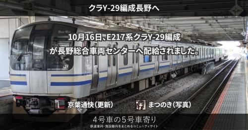 E217系 クラY-29編成長野へ 10月16日、E217系クラY-29編成が長野総合車両センターへ配給されました。 https://4gousya.net/forums/post/%E3%82%AF%E3%83%A9y-29%E7%B7%A8%E6%88%90%E3%81%8C%E9%85%8D%E7%B5%A6%E8%BC%B8%E9%80%81 2024/10/16 京葉通快 E217系