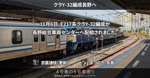 E217系 クラY-32編成長野へ 11月6日、E217系クラY-32編成が長野総合車両センターへ配給されました。 https://4gousya.net/forums/post/%E3%82%AF%E3%83%A9y-32%E7%B7%A8%E6%88%90%E3%81%8C%E9%85%8D%E7%B5%A6%E8%BC%B8%E9%80%81 2024/11/06 京葉通快 E217系