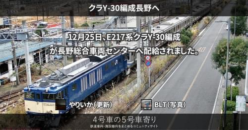 E217系 クラY-30編成長野へ 12月25日、E217系クラY-30編成が長野総合車両センターへ配給されました。 https://4gousya.net/forums/post/%e3%82%af%e3%83%a9y-30%e7%b7%a8%e6%88%90%e3%81%8c%e9%85%8d%e7%b5%a6%e8%bc%b8%e9%80%81 2024/12/25 2024/12/29 やりいか E217系