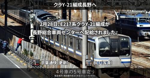 E217系 クラY-21編成長野へ 2月28日、E217系クラY-21編成が長野総合車両センターへ配給されました。 https://4gousya.net/forums/post/%e3%82%af%e3%83%a9y-21%e7%b7%a8%e6%88%90%e9%85%8d%e7%b5%a6%e8%bc%b8%e9%80%81 2024/02/28 京葉通快 E217系