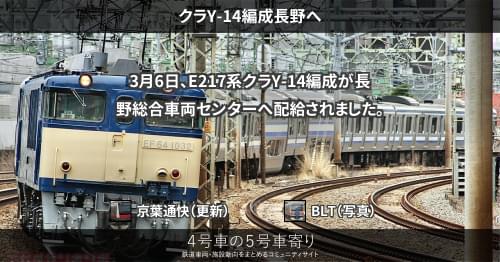 E217系 クラY-14編成長野へ 3月6日、E217系クラY-14編成が長野総合車両センターへ配給されました。 https://4gousya.net/?post_type=topic&p=76327 2024/03/06 2024/03/07 京葉通快 E217系