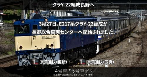 E217系 クラY-22編成長野へ 3月27日、E217系クラY-22編成が長野総合車両センターへ配給されました。 https://4gousya.net/forums/post/%e3%82%af%e3%83%a9y-22%e7%b7%a8%e6%88%90%e3%81%8c%e9%85%8d%e7%b5%a6%e8%bc%b8%e9%80%81 2024/03/27 2024/03/29 京葉通快 E217系
