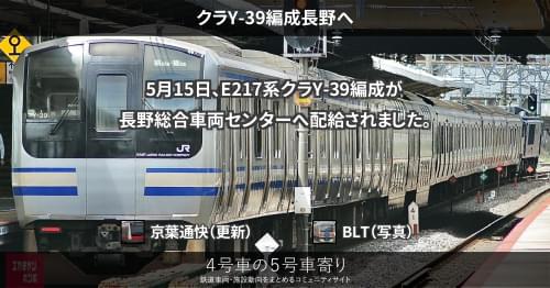 E217系 クラY-39編成長野へ 5月15日、E217系クラY-39編成が長野総合車両センターへ配給されました。 https://4gousya.net/forums/post/%e3%82%af%e3%83%a9y-39%e7%b7%a8%e6%88%90%e3%81%8c%e9%85%8d%e7%b5%a6%e8%bc%b8%e9%80%81 2024/05/15 2024/05/18 京葉通快 E217系