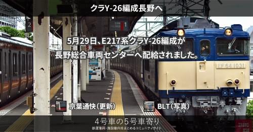 E217系 クラY-26編成長野へ 5月29日、E217系クラY-26編成が長野総合車両センターへ配給されました。 https://4gousya.net/forums/post/%e3%82%af%e3%83%a9y-26%e7%b7%a8%e6%88%90%e3%81%8c%e9%85%8d%e7%b5%a6%e8%bc%b8%e9%80%81 2024/05/29 京葉通快 E217系
