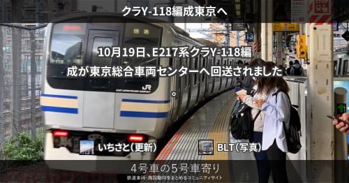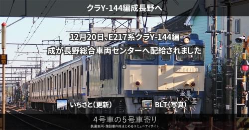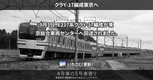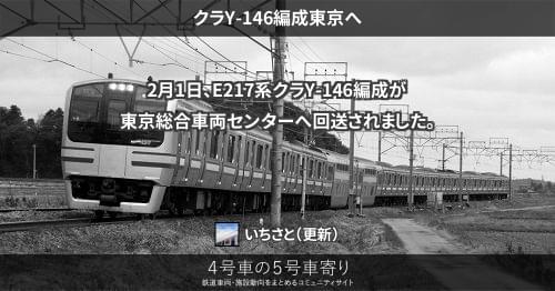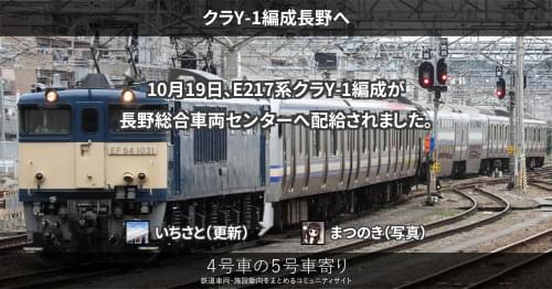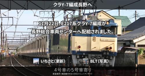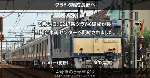 E217系 クラY-6編成長野へ 9月14日、E217系クラY-6編成が長野総合車両センターへ配給されました。 https://4gousya.net/forums/post/%e3%82%af%e3%83%a9y-6%e7%b7%a8%e6%88%90%e9%85%8d%e7%b5%a6 2022/09/14 わいけー E217系