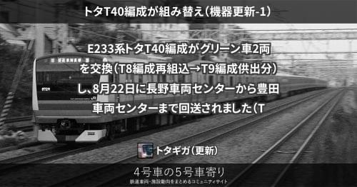 E233系トタT40編成がグリーン車2両を交換(T8編成再組込→T9編成供出分)し、8月22日に長野車両センターから豊田車両センターまで回送されました(TsdTsd'56→TsdTsd'17)。