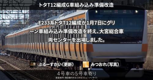 E233系 トタT12編成G車組み込み準備改造 E233系トタT12編成が1月7日にグリーン車組み込み準備改造を終え、大宮総合車両センターを出場しました。 2022/01/07 ぶるーすかい E233系