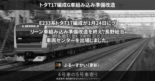 E233系 トタT17編成G車組み込み準備改造 E233系トタT17編成が1月24日にグリーン車組み込み準備改造を終え、長野総合車両センターを出場しました。 2022/01/24 ぶるーすかい E233系