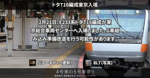 E233系 トタT16編成東京入場 2月21日、E233系トタT16編成が東京総合車両センターへ入場しました。 G車組み込み準備改造を行う可能性があります。 2022/02/21 ぶるーすかい E233系