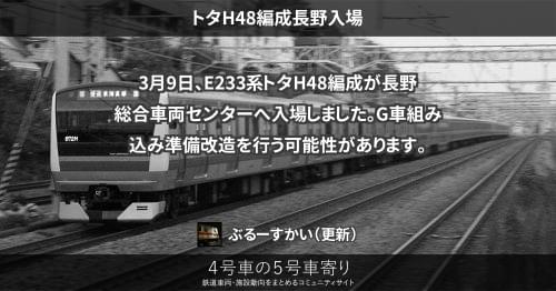 E233系 トタH48編成長野入場 3月9日、E233系トタH48編成が長野総合車両センターへ入場しました。 G車組み込み準備改造を行う可能性があります。 2022/03/09 ぶるーすかい E233系
