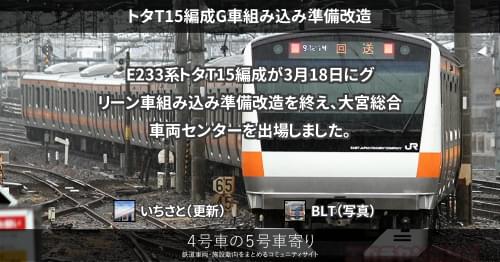E233系 トタT15編成G車組み込み準備改造 E233系トタT15編成が3月18日にグリーン車組み込み準備改造を終え、大宮総合車両センターを出場しました。 2022/03/18 2022/03/19 いちさと E233系