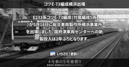 E233系 コツE-73編成横浜出場 E233系コツE-73編成(付属編成5両)が5月18日に総合車両製作所横浜事業所を出場しました。 国府津車両センターへの新製投入は2年ぶりとなります。 2017/05/18 いちさと E233系