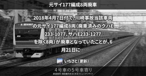 E233系 元サイ177編成8両廃車 2018年4月7日付で、川崎事故当該車両の元サイ177編成8両(廃車済みのクハE233-1077、サハE233-1277を除く8両)が廃車となっていたことが、6月21日に明らかとなりました。 2018/06/21 2018/06/25 いちさと E233系
